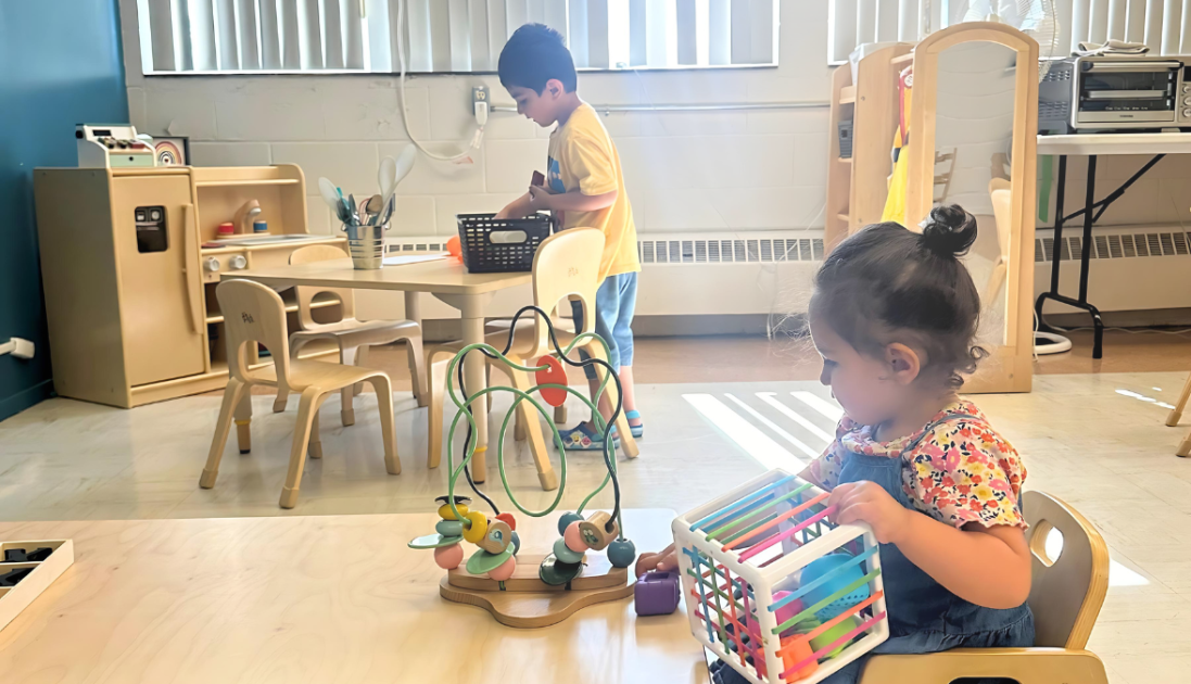 Saba says they go to three different EarlyON Centres and spend about three hours there each day. Her son, an active three-year-old, is off doing his own thing, finding his friends and playing. Her daughter, just one and a half years old, sticks close to her. They play together and Saba chats with the other mothers.